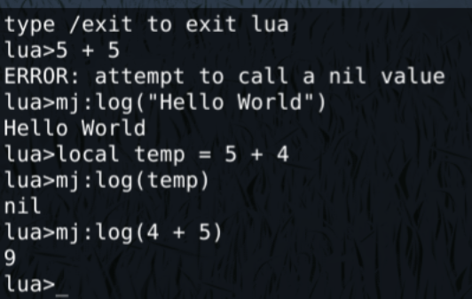 Once in lua mode, there are a few useful functions you might want to call: