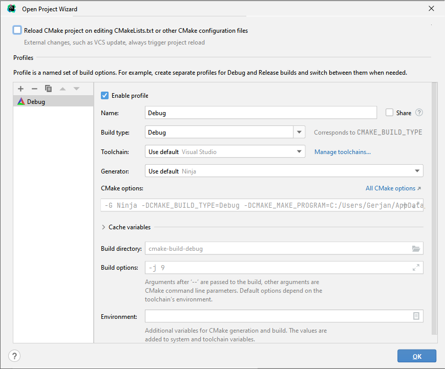 Now it's time to configure all settings. Open the CMake tab at the bottom, press the small gear at the left of the tab and open CMake Settings. In the tab that opens you can configure the Cache variables by opening the Cache variables dropdown if it's not opened by default. Change the values to match your mod (Name, Description, etc.) and press Apply.