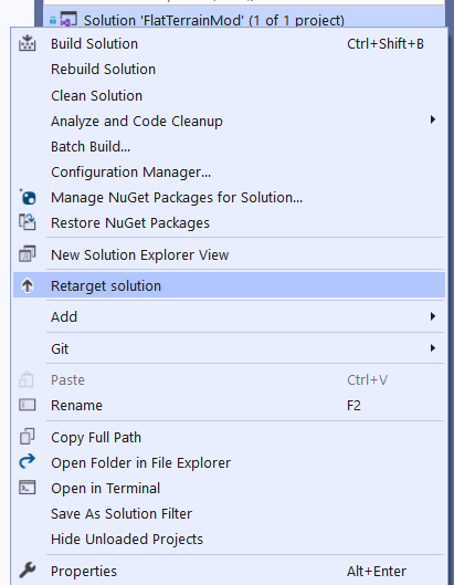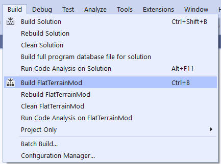 the mod can be compiled by Build -> Build FlatTerrainMod. This will generate a dll file in Windows\Build\. This dll file should be moved into your mod's lib folder.